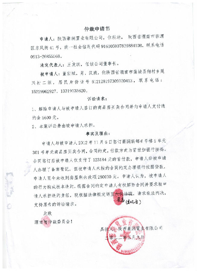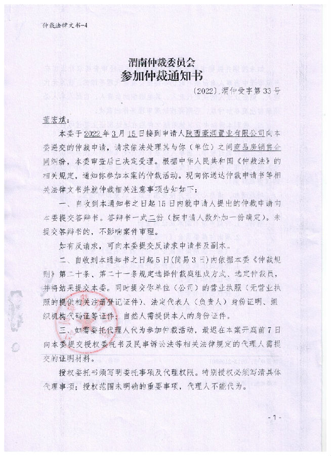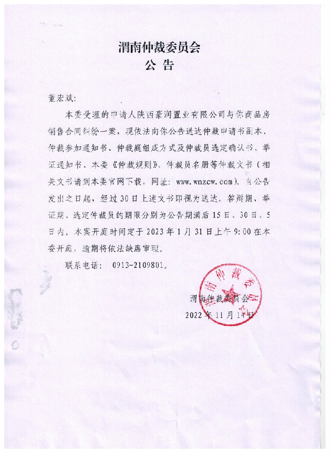 陜西豪潤(rùn)置業(yè)有限公司與董宏斌一案公告