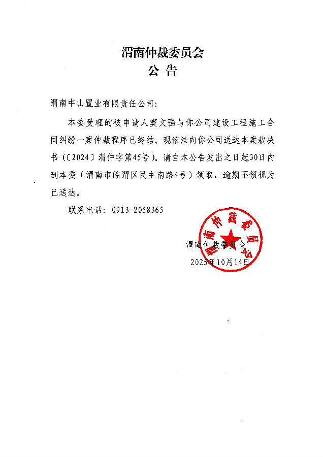 渭南中山置業(yè)有限責(zé)任公司與竇文強(qiáng)建設(shè)工程施工合同糾紛案公告
